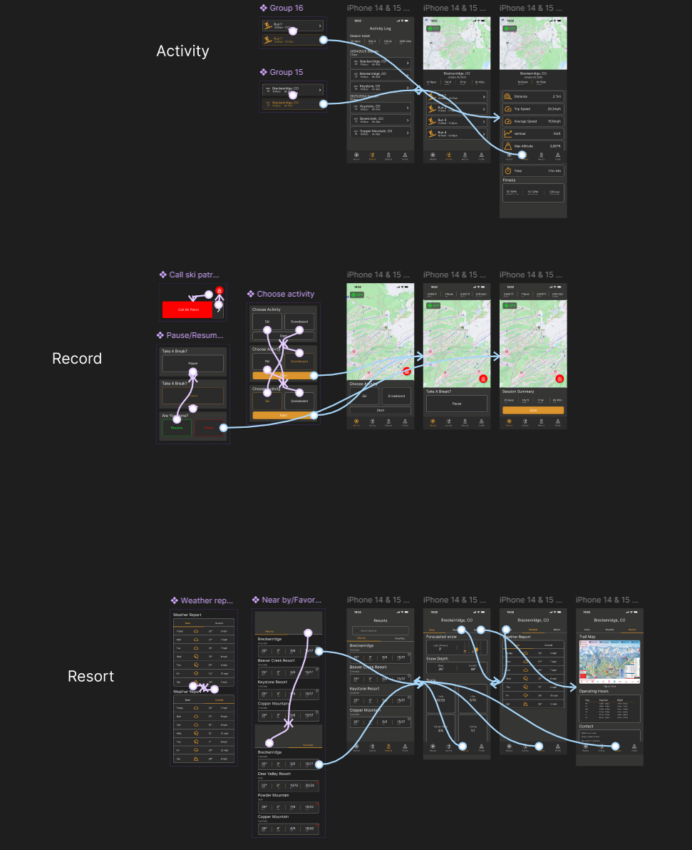 A preliminary version of the app was created to visualize the functionality of the design. This prototype takes users through the 3 flows of Activity, Record, and Resort