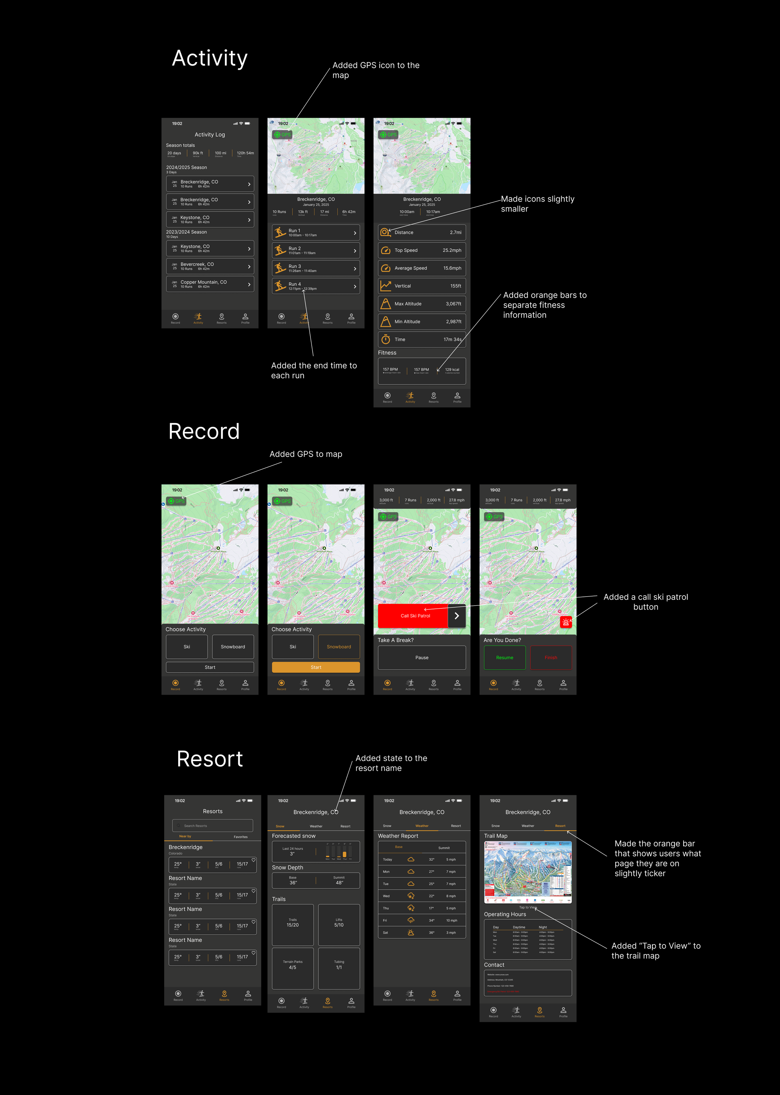 The second and final iteration reprioritized the structure of the app and created new pages. Record, Activity, Resorts, and Profile.